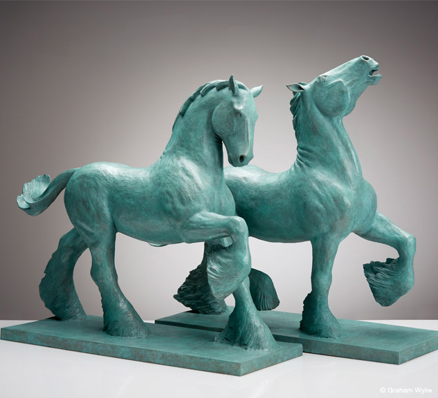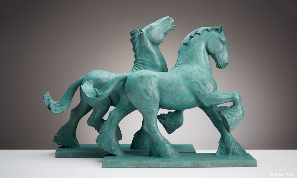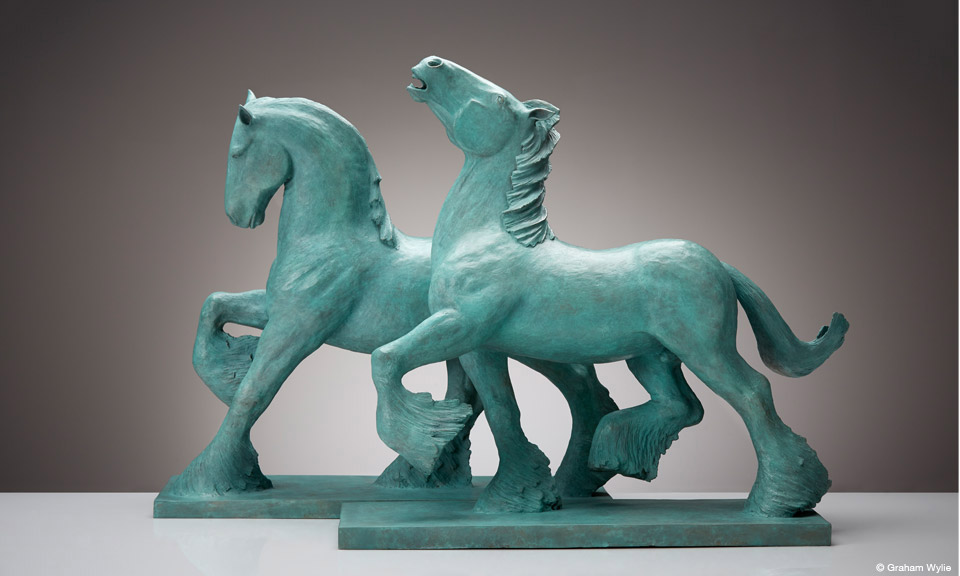 Scale 1:200 bronze sculptures of the full Kelpies horses. They are Andy's imagining of the full horse below the water line of The Kelpies heads.